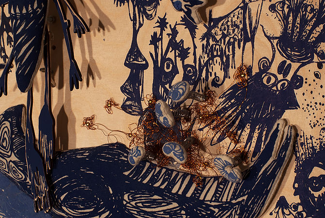 Materials used in work vary from plywood to soft tricot fabric. The main technique is silk-screen printing, however, different variations are used: pigment, puff, flock and foil. Silk-screen printing is used both in fabric and in plywood. The colour palette is rather peaceful, bluish colours and some copper accent. In addition, light bulbs, springs and copper wire are used. To find the perfect base to print on plywood experiments were needed. Transparent base diffused, at the same time white base required a lot of pigment. By mixing different bases together new base was made. To create right shade for the flock, the glue had to be coloured and used together with the translucent white flock.
